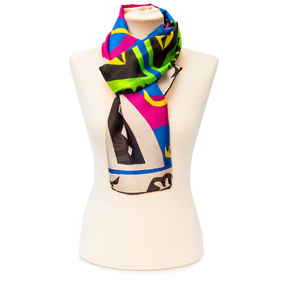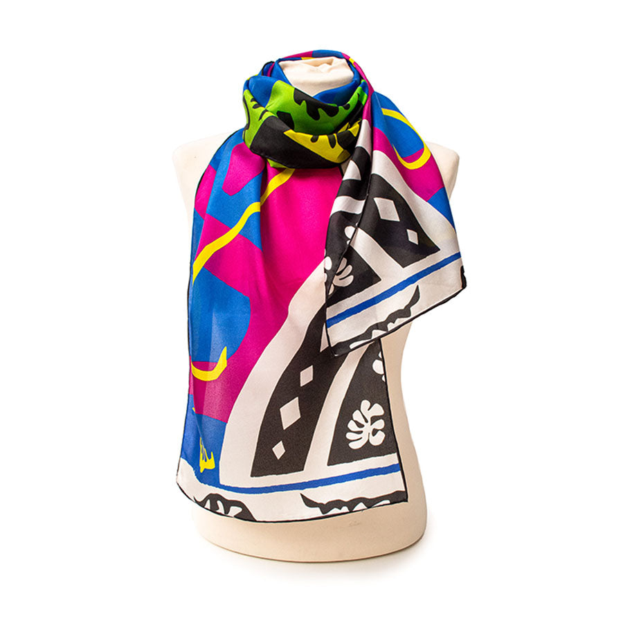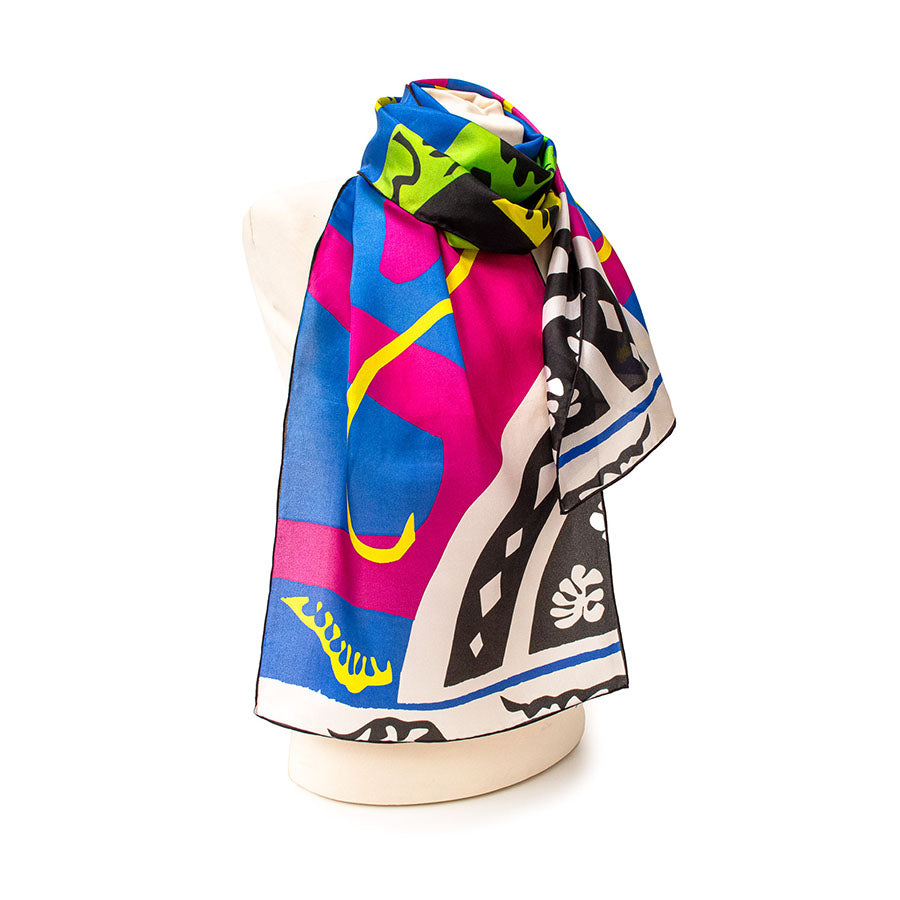 A bright Fox & Chave silk habotai scarf with a design after the work Horse, Rider, and Clown (1947) by the French Fauvist artist Henri Matisse (1869-1954).