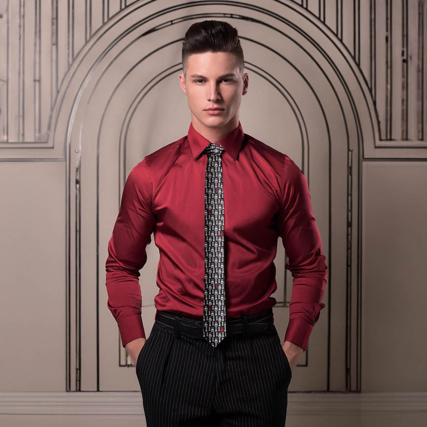 A Fox & Chave silk tie looks best tied in a classic Windsor or half-Windsor knot and worn with a collar style of your choosing. Cutaway or spread collars offer the greatest opportunity to display the detail of your unique silk tie design.