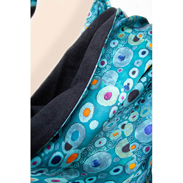 The original polka dot pattern has been transposed from the source painting to a bright alternative turquoise version and printed on a glossy satin silk. A brushed silk lining on the reverse offers the feel of cashmere. Each scarf is individually hand finished.