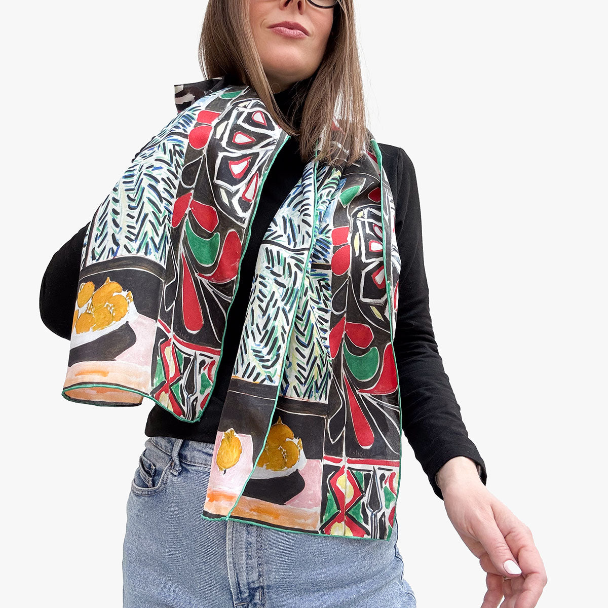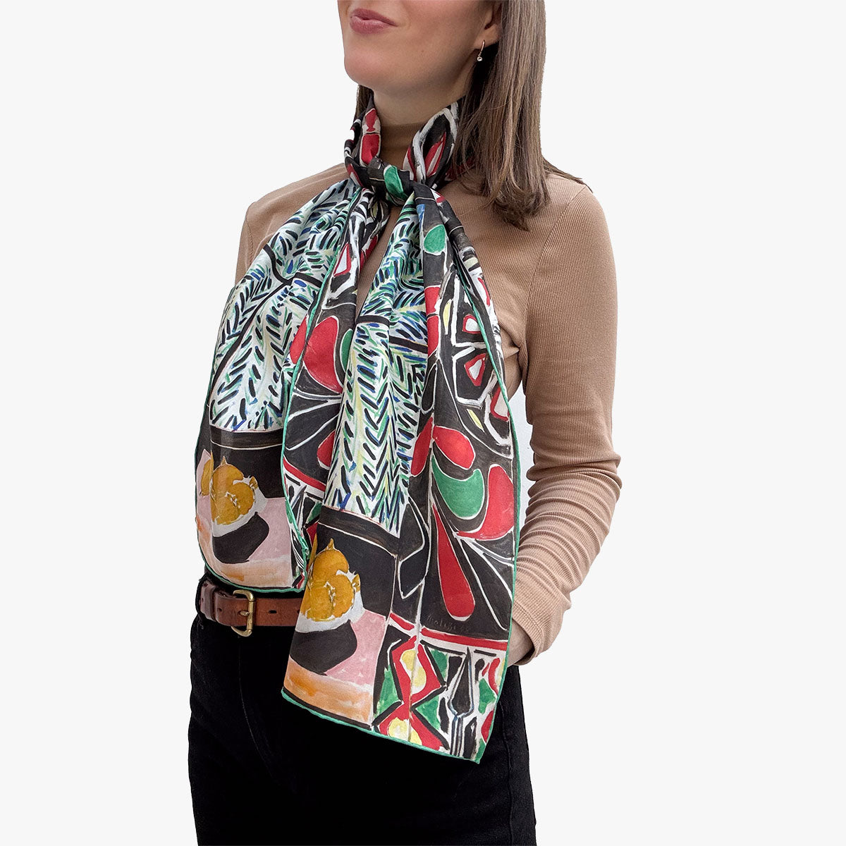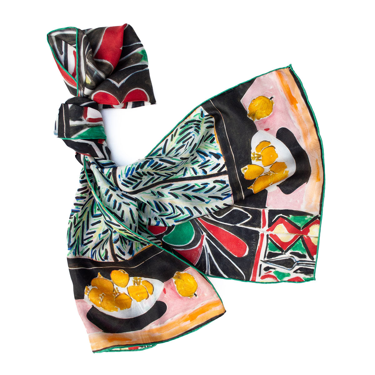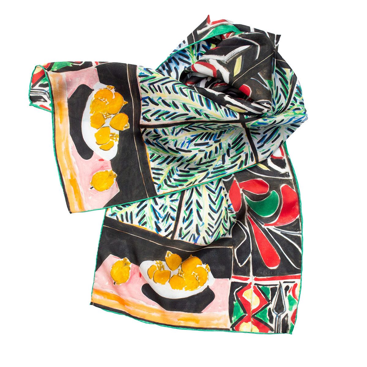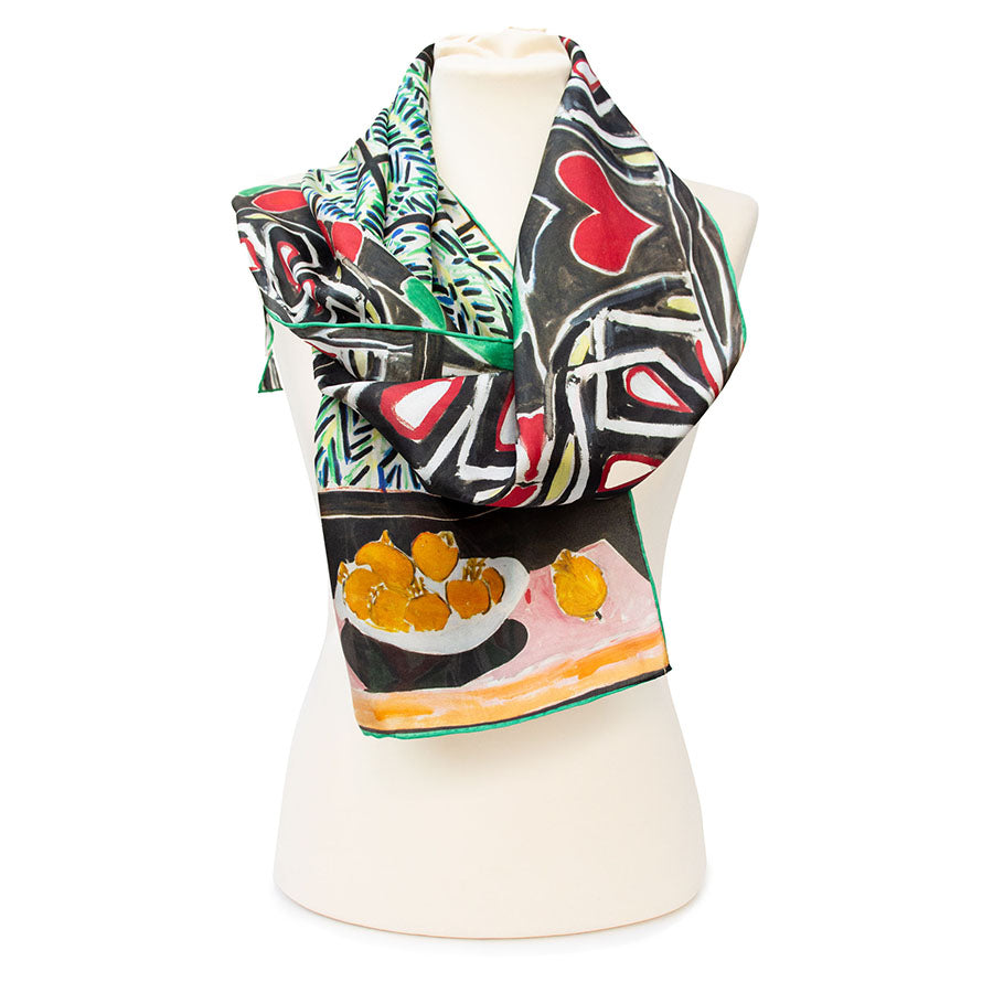 An exciting Fox & Chave silk habotai scarf with a design after the work Interior with Egyptian Curtain (1948) by the French Fauvist and Modernist artist Henri Matisse (1869-1954).