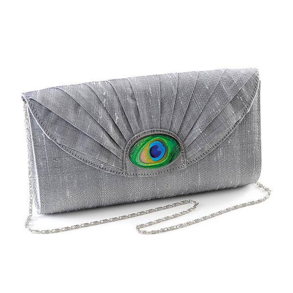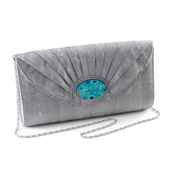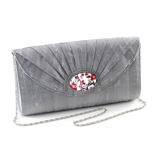 This stunning Cameo clutch bag is covered in pure raw silk and has a co-ordinated lining with a hidden shoulder chain. Closed with an invisible magnetic closure, it also has an internal zip pocket. Each bag is supplied with a matt black, drawstring dust bag. Available with a choice of 12 cameo designs.