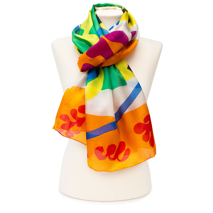 A vibrant Fox & Chave silk habotai scarf with a design after the work The Codomas (1947) by the French Fauvist and Modernist artist Henri Matisse (1869-1954).