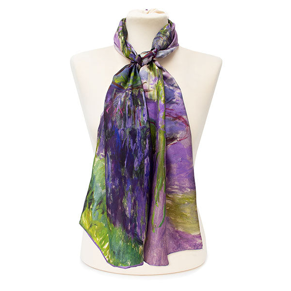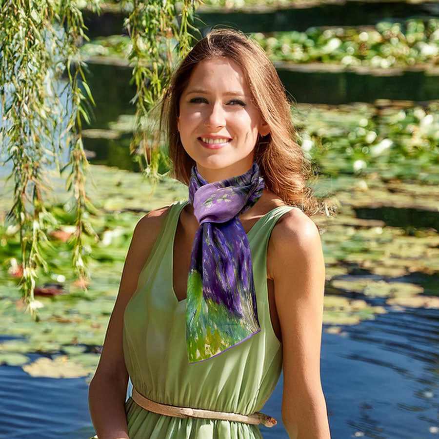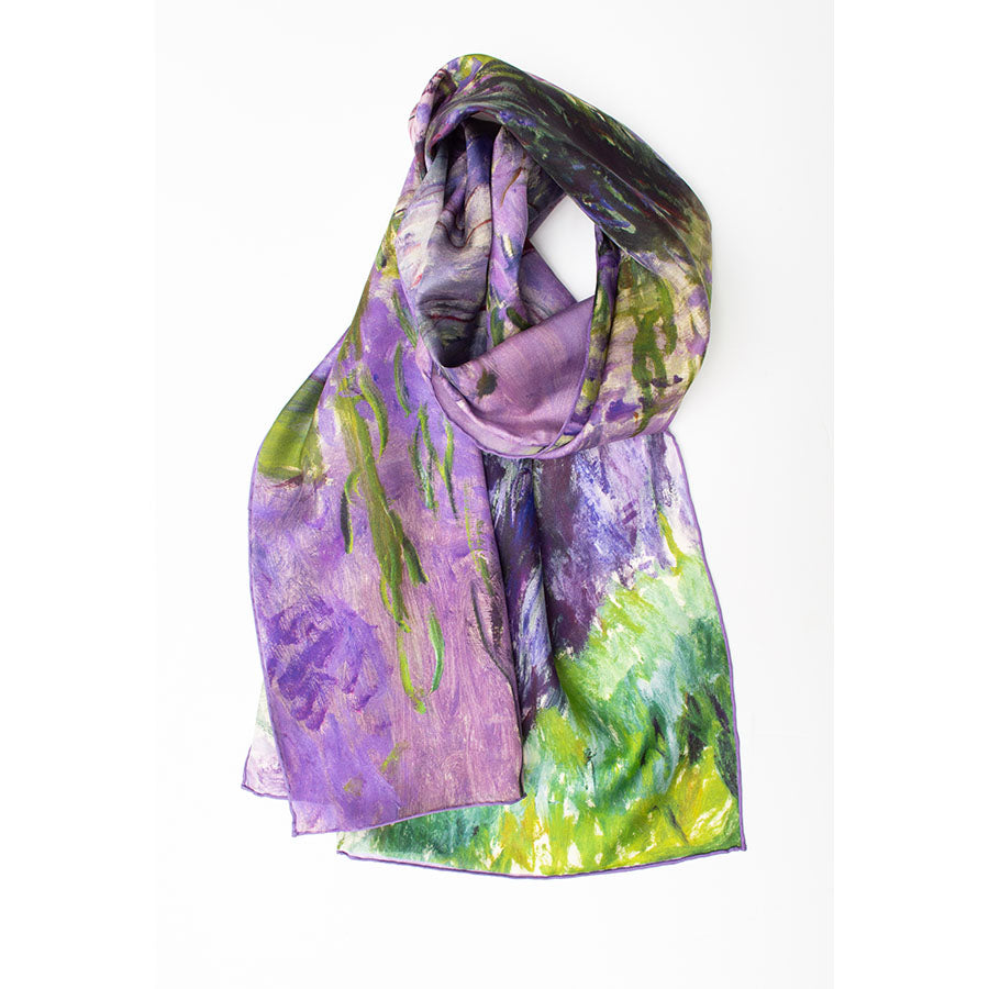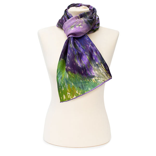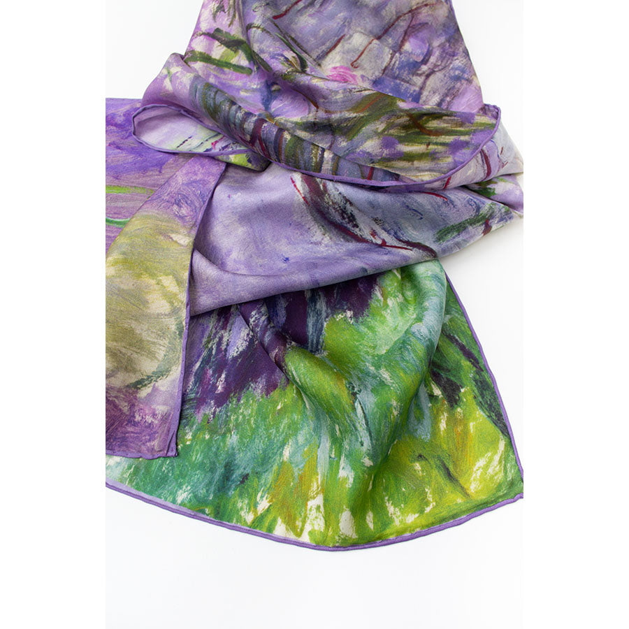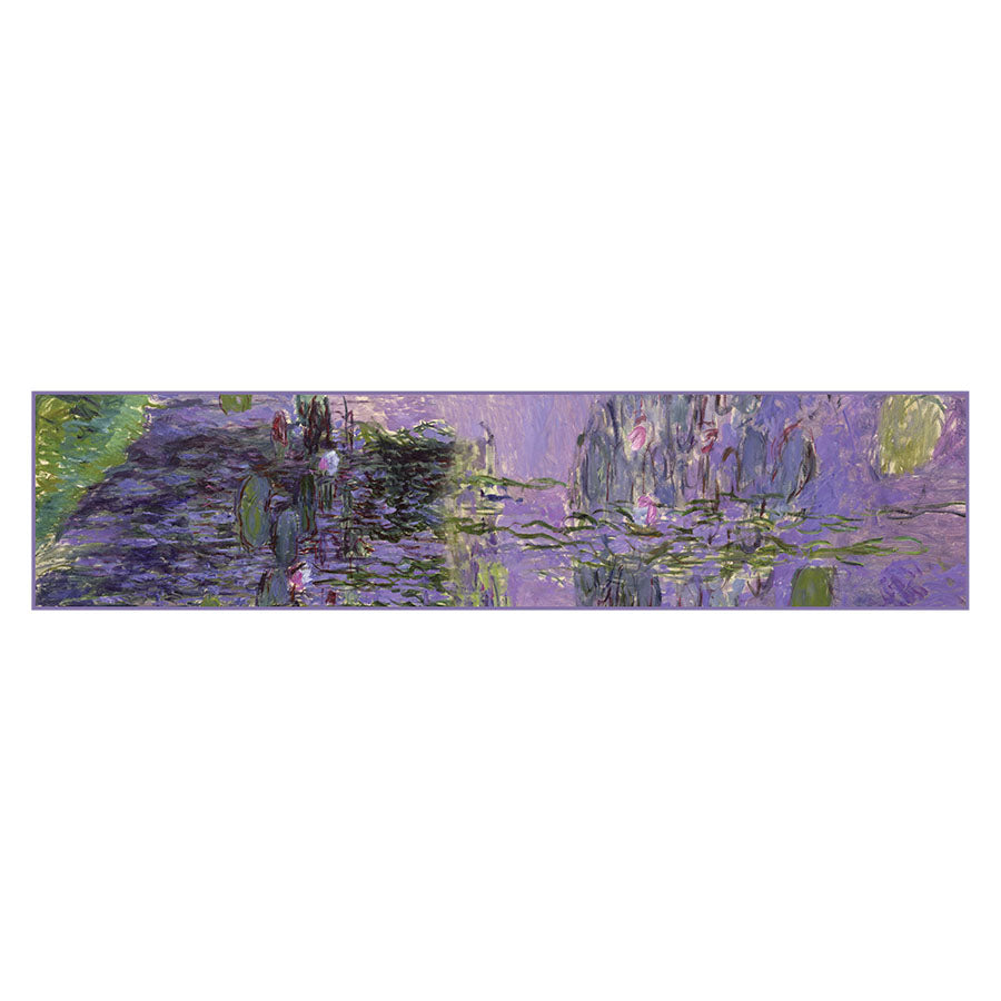 A purple, lilac and green Fox & Chave silk habotai scarf featuring an element of one of more than two hundred paintings in the Waterlilies series by Claude Monet (1840-1926). This one was painted between 1916 and 1919.
